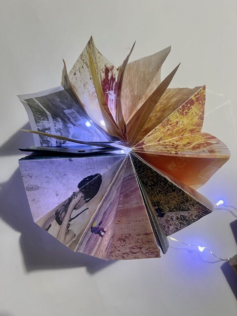 Livro com acabamento de costura japonesa. Colagens com intervenção em fotos do arquivo pessoal em papel color plus e capa em papel Kraft.